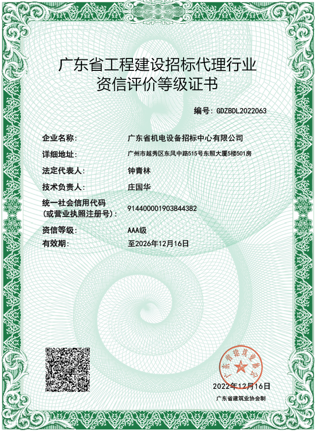 近日,经过广东省建筑业协会的评审,MK网页版登录入口(以下简称招标中心)获得协会颁发的《广东省工程建设招标代理行业资信评价等级证书(AAA级)》。