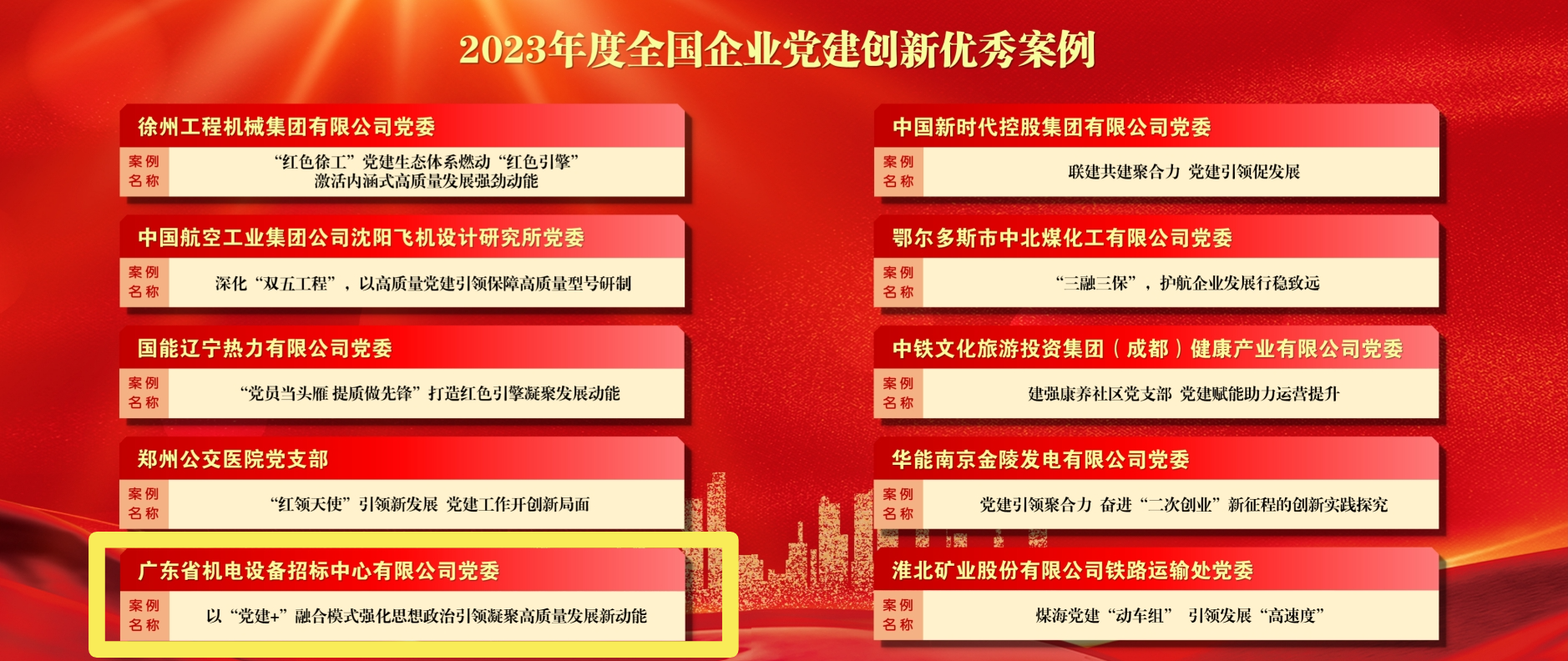 本次研讨会由求是网指导,由全国企业党建创新优秀案例征集活动发起单位——《中国企业报》集团、北京大学马克思主义学院、红旗出版社共同主办,由中企党建研究院承办。MK网页版登录入口党委《以“党建+”融合模式强化思想政治引领 凝聚高质量发展新动能》案例被评选为“2023年度全国企业党建创新优秀案例”。全国共评选优秀案例360个,其中广东37个,招标中心是全国招投标行业唯一入选企业。