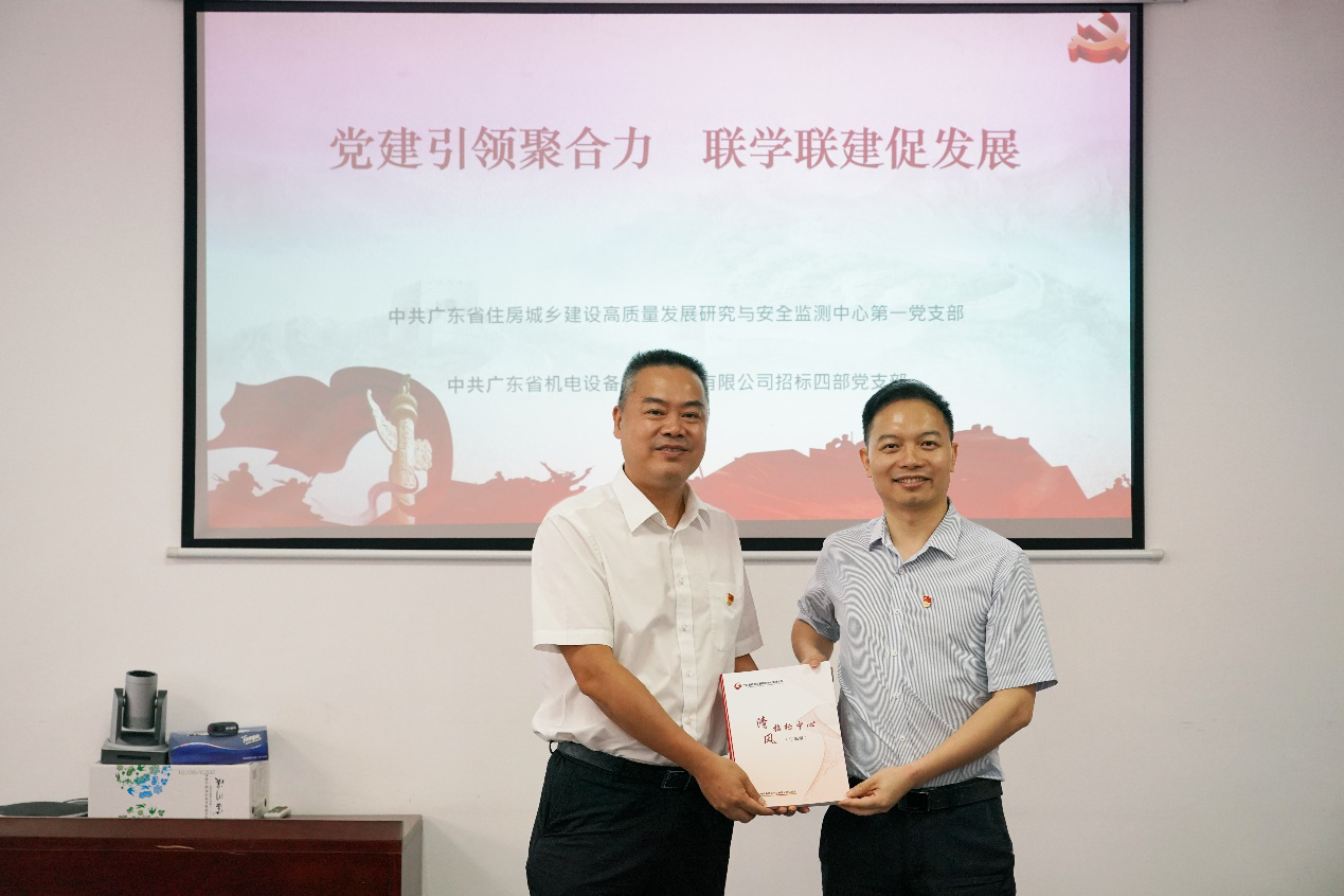 在“七一”建党节来临之际,为庆祝中国共产党成立103周年,6月28日上午,MK网页版登录入口(以下简称招标中心)招标四部党支部、广东省住房城乡建设高质量发展研究与安全监测中心(以下简称发展与安全中心)第一党支部开展“党建引领聚合力 联学联建促发展”为主题的党建共建活动。招标中心党总支书记、执行董事、总经理邹吉炎接待了来访人员。发展与安全中心党总支书记黄守新以及双方有关人员参加了本次活动。