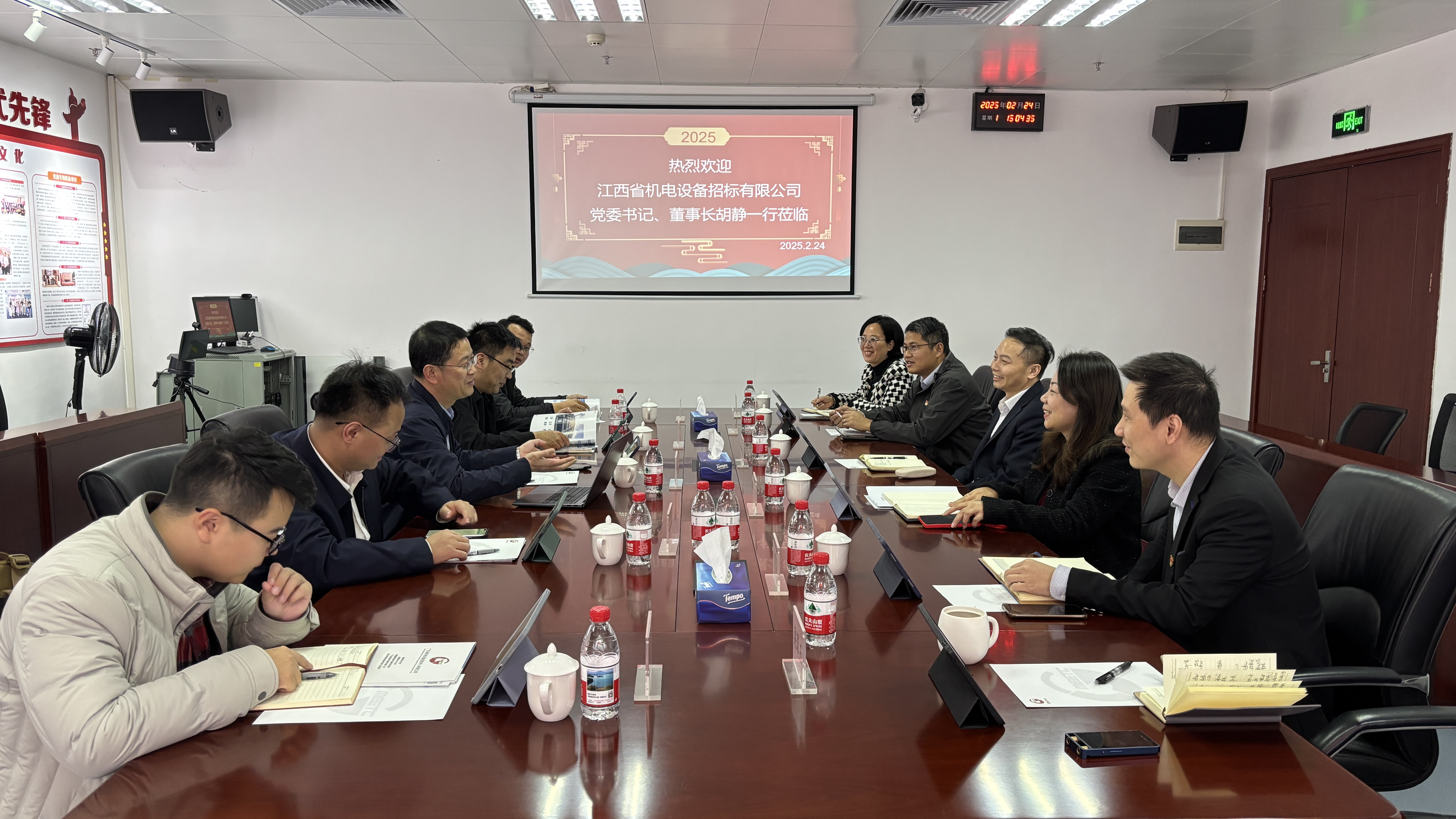 2月24日,江西省机电设备招标有限公司(以下简称江招公司)党委书记、董事长胡静一行莅临招标中心,双方围绕招标行业发展趋势、行业痛点难点、党风廉政建设、经营管理模式及信息化建设等进行了深入交流。 招标中心党总支书记、执行董事、总经理邹吉炎对胡静一行的到访表示热烈欢迎,并介绍了招标中心近年来重组改革发展历程。他表示,面对招标行业政策的持续调整和市场环境的需求变化,招标中心始终以改革为驱动,积极推进组织优化与业务创新,深入探索新的转型方向。同时,他还围绕推动新业态发展、优化业务合作模式以及上市公司关键指标要点进行了经验分享。 国义招标股份有限公司党委委员、纪委书记徐惊群重点介绍了深化廉洁风险防范、创新廉洁教育、探索综合监督体系等方面的创新举措,希望通过加强双方在党风廉政建设领域的经验分享与合作,共同探索行业廉洁生态建设新路径,为营造风清气正的招标环境贡献力量。胡静对招标中心的热情接待表示感谢,并围绕廉政建设、经营管理、平台建设等方面分享了江招公司的实践经验与创新成效。他表示,希望双方能够发挥各自优势,持续加强沟通交流,互相学习借鉴,携手探索行业发展新路径,共同推动招标行业的高质量发展。 招标中心党总支委员、副总经理陆冠兵、叶耀华,国义招标及招标中心相关职能部门人员,江西省机电设备招标有限公司副总经理王聪,研创中心主任梁峰,江西省精彩纵横采购咨询有限公司技术总监李球,数据开发工程师熊文韬参加座谈。