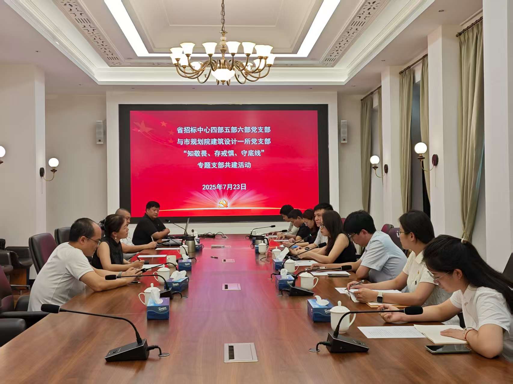 会上,招标中心党总支委员、副总经理陈芳、市规划院建筑一所副总工曾琦分别带领与会人员学习重要文件精神,深入学习中央八项规定精神有关部署要求,并强调全体参会人员须严守纪律规矩、永葆清正廉洁政治本色。随后,双方领导分别系统介绍本单位近年来党建工作成效、业务发展态势及当前面临的机遇挑战,重点分享党建创新实践中的典型经验和特色做法。聚焦如何加强党组织共建、促进业务合作等关键议题,双方展开了深入交流研讨。